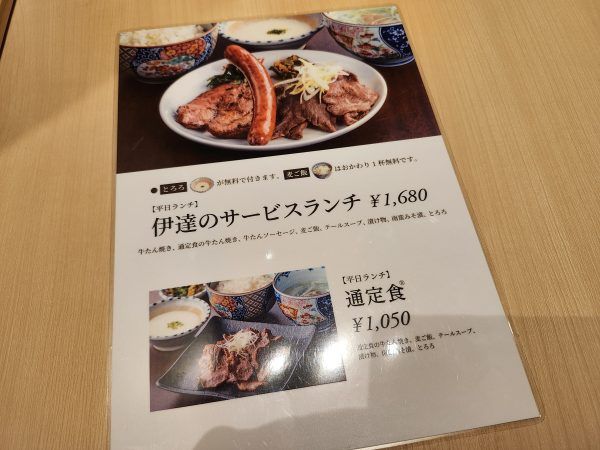 平日限定ランチは2種類ありました! 牛たん焼き・通定食の牛たん焼き・牛タンソーセージがメインの「伊達のサービスランチ」と、通定食の牛たん焼きがメインの「通定食」。どちらも麦ご飯・テールスープ・漬け物・とろろがつき、麦ご飯は、おかわりが1杯無料という嬉しいサービスもあります!