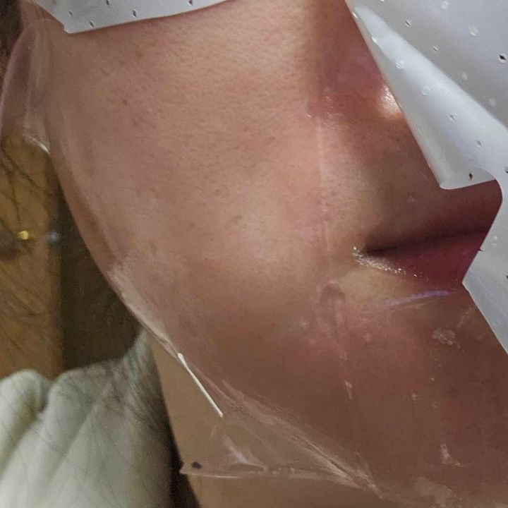 数時間後のフィルムマスクがこちら。貼ったときは気づかなかったけどうっすらピンクなのねあなた。