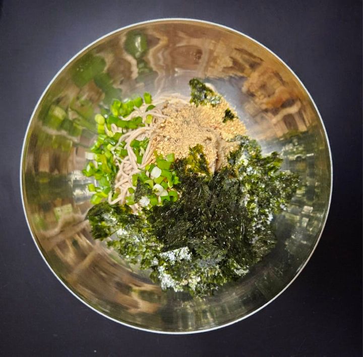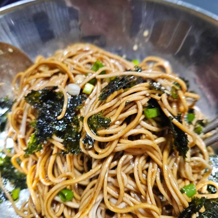こちらが自作のマッククス。細めのそば(乾麺)を買ってきて茹でて水で洗ってしぼって、ネギ、すりごま、韓国のりに、好きなタレを作ってえごま油をかけて和えるだけ。とっても簡単。タレは醤油、酢、砂糖なんかを適当に混ぜた味が主流だそうですが、面倒くさかったらめんつゆかけたり、オイスターソースを混ぜてみたりしてもいいかも。