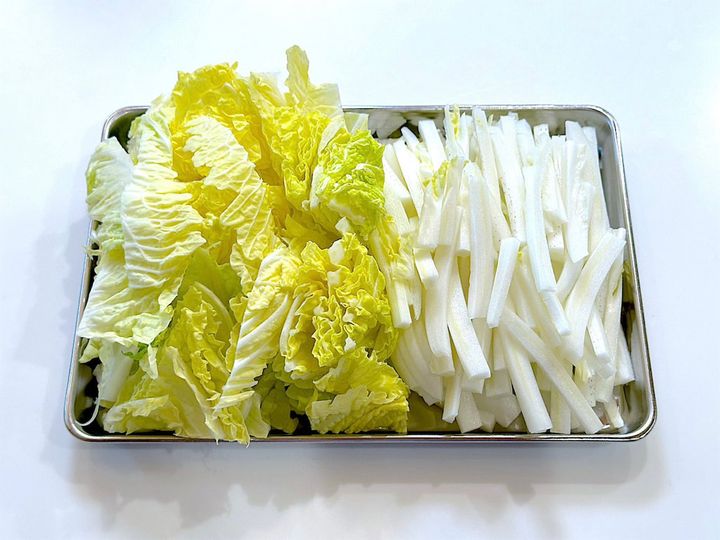 1. 白菜は軸と葉に分け、軸は繊維に沿って細切り、葉はざく切りにする。