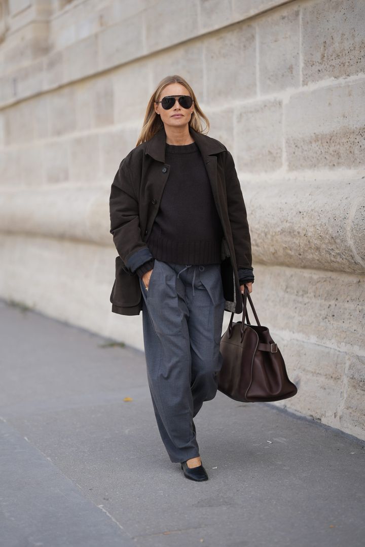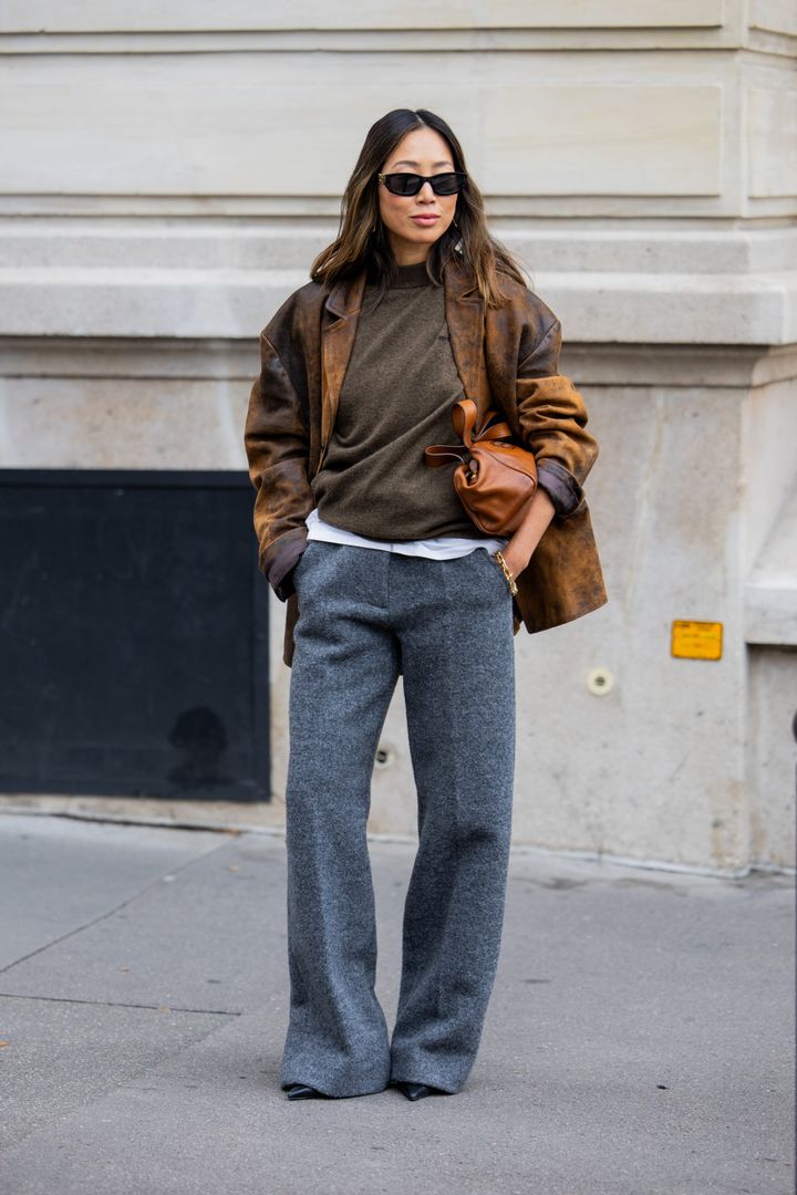 エフォートレスなグレーパンツは、ダークブラウンとの配色で洗練された大人コーデに。ビッグバッグもこなれ感の秘訣。