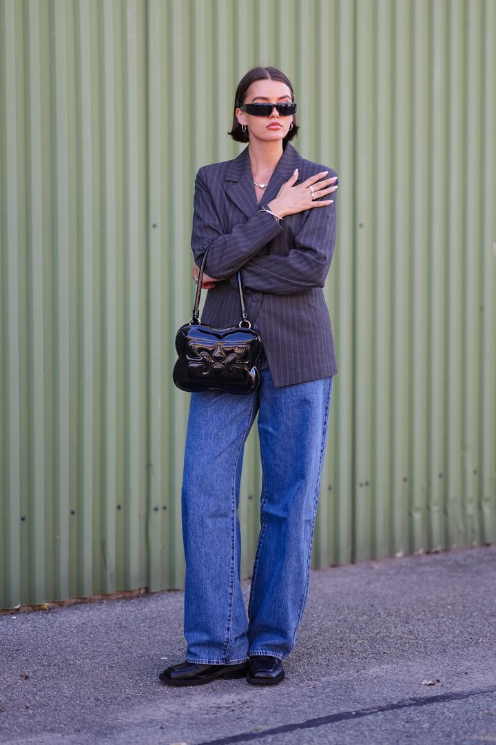 シャープなグレージャケット×デニムの着こなしはファッショニスタの鉄板。パテントバッグやナローなサングラスなど、モード感の高い小物でのスパイスアップは欠かせません。