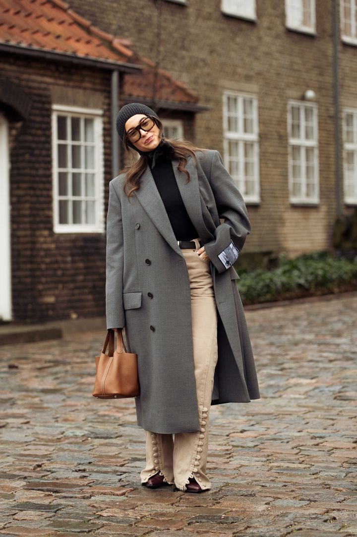 オーバーサイズコートを主役に、グレーのグラデーションをメイク。ライトベージュのバッグをアクセントにすることで、着こなしにメリハリが出てぐっと印象的に。