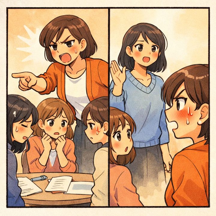 3. 「みんなはこれに従って動いてね!」と独裁者のように仕切りたがるママ友。だが、他のママ友の正論をうけ表情が一変