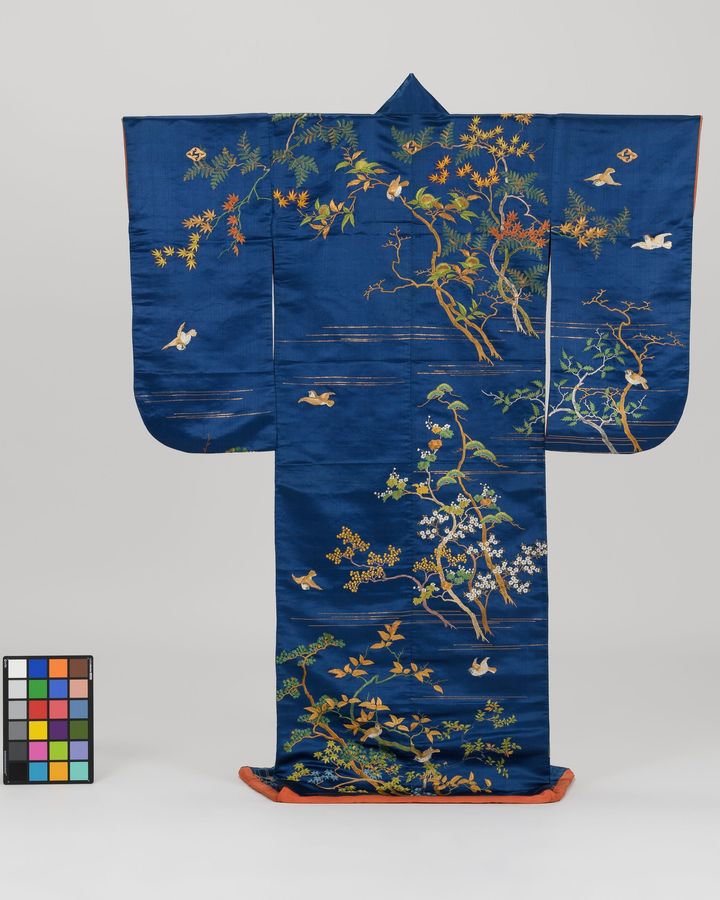 (紺繻子地立木雀模様振袖 明治時代・19世紀/株式会社丸紅藏