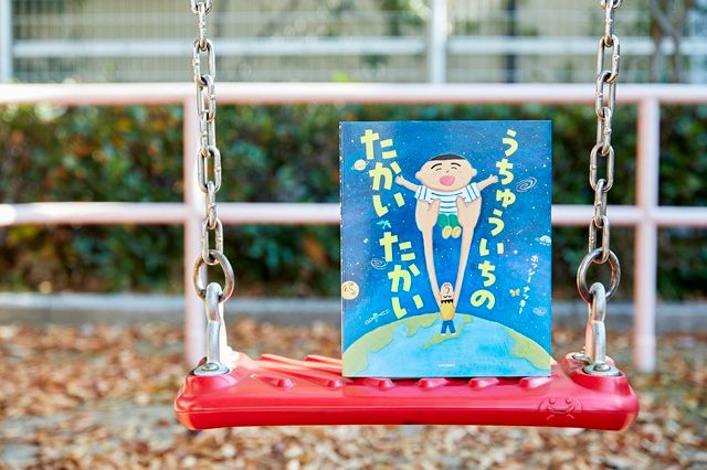 『うちゅういちの たかいたかい』が生まれたきっかけは、ご主人が息子さんを“高い高い”したときのひと言。「パパの筋肉を鍛えたら、木よりもビルよりも高くなるかな?」
