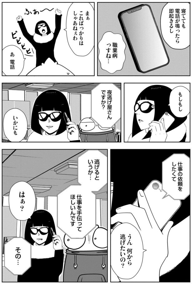 「夜逃げ屋」とは、DVをするパートナーや毒親などから逃げたい人々の引っ越しを手伝う特殊な業者。漫画家を目指していた作者・宮野シンイチはある日、TVで見かけた夜逃げ屋という仕事と、そこを取り仕切る女社長の漫画を描きたいと思い取材を申し込む。取材当日、夜逃げの現場を手伝うことになった宮野は、壮絶な現場を目の当たりにした後、社長の鶴の一声で夜逃げ屋に就職することにーー。外からは普通に見える家庭でも、一歩踏み入れると見えてくる衝撃的な現実。実際に夜逃げ屋で働く作者が、その現場をリアルに描くコミックエッセイ『夜逃げ屋日記』を、ご好評につき再連載いたします。