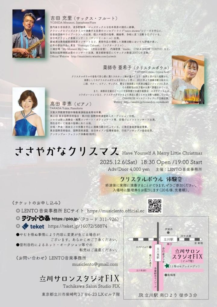 先日、子どもの同級生のママさんのコンサートへ行ってきました。ピアニストの高田幸恵さんです。今回は立川で『ささやかなクリスマス』というコンサートで、サックス奏者の吉田充里さん、クリスタルボウル奏者の薬師寺亜希子さんとの演奏でした。