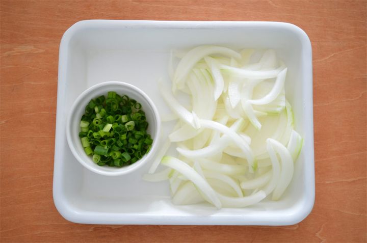 3. 焼いている間に、玉ねぎを1cm幅、青ねぎを小口切りにする。
