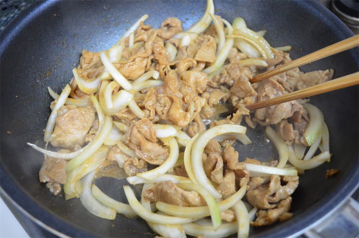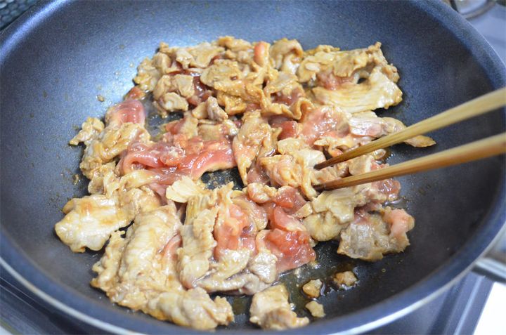 2. 豚丼を作る。凍った1をそのままフライパンに入れて水を加え、フタをして弱火で8分ほど蒸し焼きにする。