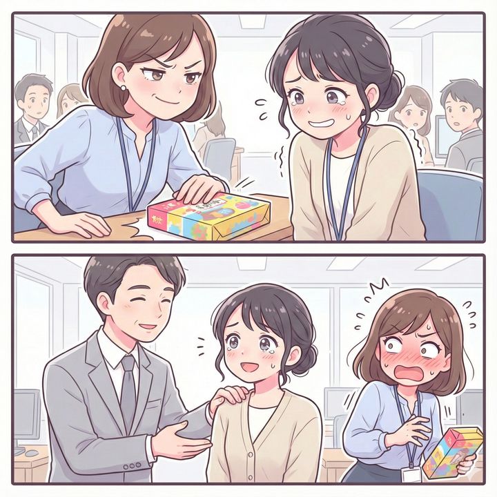 そんな中、私のデスクに同僚の女性がやってきました。彼女は手に有名な地方菓子を抱え、わざと大きな音を立てて私の机に置きました。