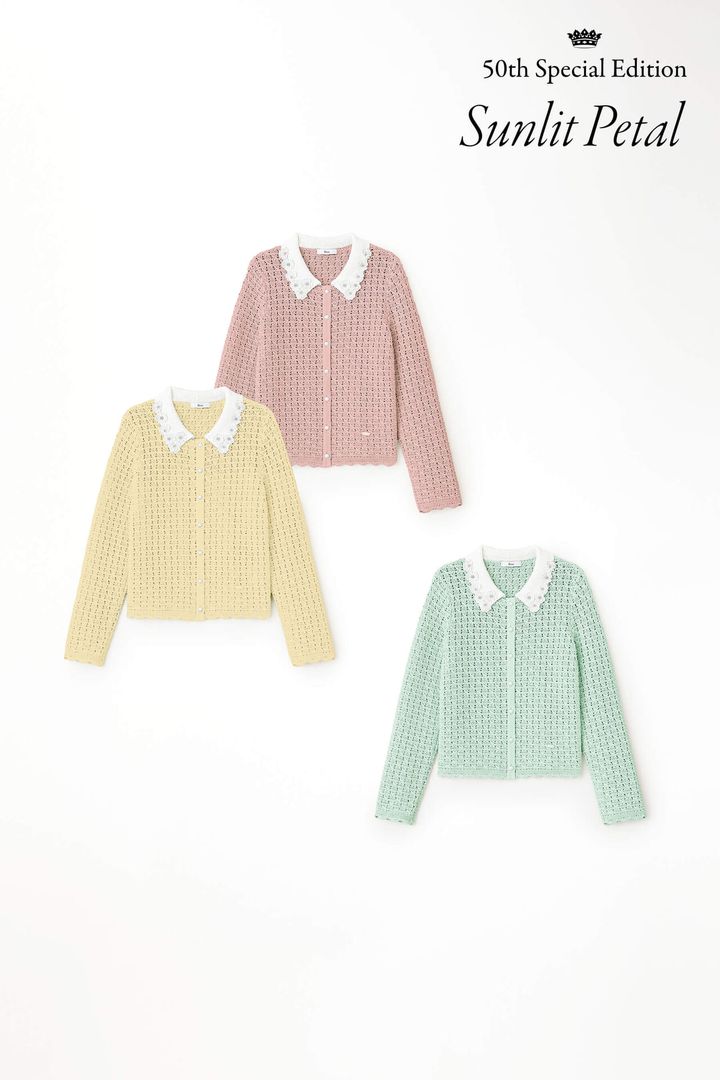 たっぷりとあしらったフラワーモチーフが心を弾ませる、クロシェ風ニットカーディガン。爽やかな白襟とのコンビネーションが、可憐さの中に品のよさを添えてくれます。色とりどりのラインナップで、選ぶ時間までも楽しみに変えてくれる一枚です。