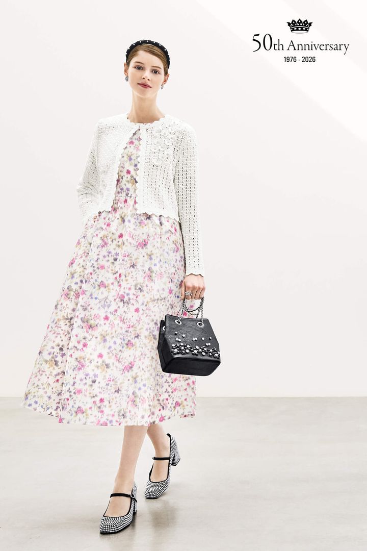ルネの真骨頂ともいえる、華やかなフラワープリントワンピースもお目見え。淡くにじむ花柄と、軽やかな膨れ織りの生地が、装いに奥行きを添えます。フラワーモチーフのニットカーディガンを重ねれば、季節の移ろいをやさしく感じる、軽やかなレイヤードスタイルに。