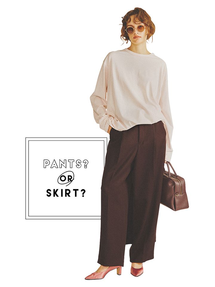 どちらにも長さとゆとりがあるルーズな上下。前からはパンツ、後ろからはスカートに見えるデザイン性の高いボトムでモードに昇華。シルエットを都合よく隠すスカートのリラックス感と、分かれた股下ですっきり見せるパンツならではのシャープさを両得。トップスはそれとなくINしてバランスを調整。色をとり入れてもうひとひねり。
