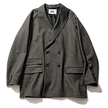 グレージャケット/HER. ほのかな起毛感でグレンチェックの渋さを緩和。ドロップショルダーは肩幅をごまかす効果が。シワになりにくい加工がほどこされたウール素材もうれしいポイント。