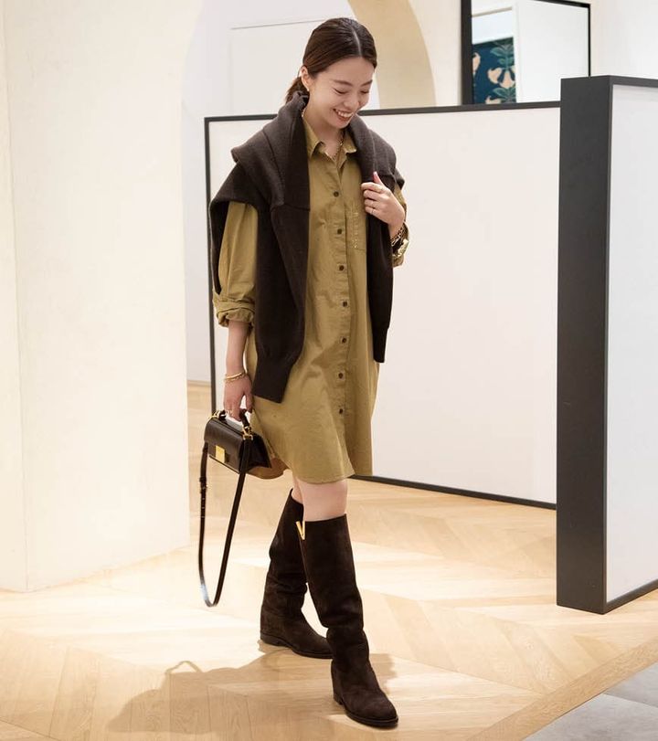 「ゴールドのV字デザインが脚を美しく見せてくれる乗馬ブーツを主役に、シンプルなシャツドレスを合わせました。ボルドーのバッグで品性と大人っぽさを」
