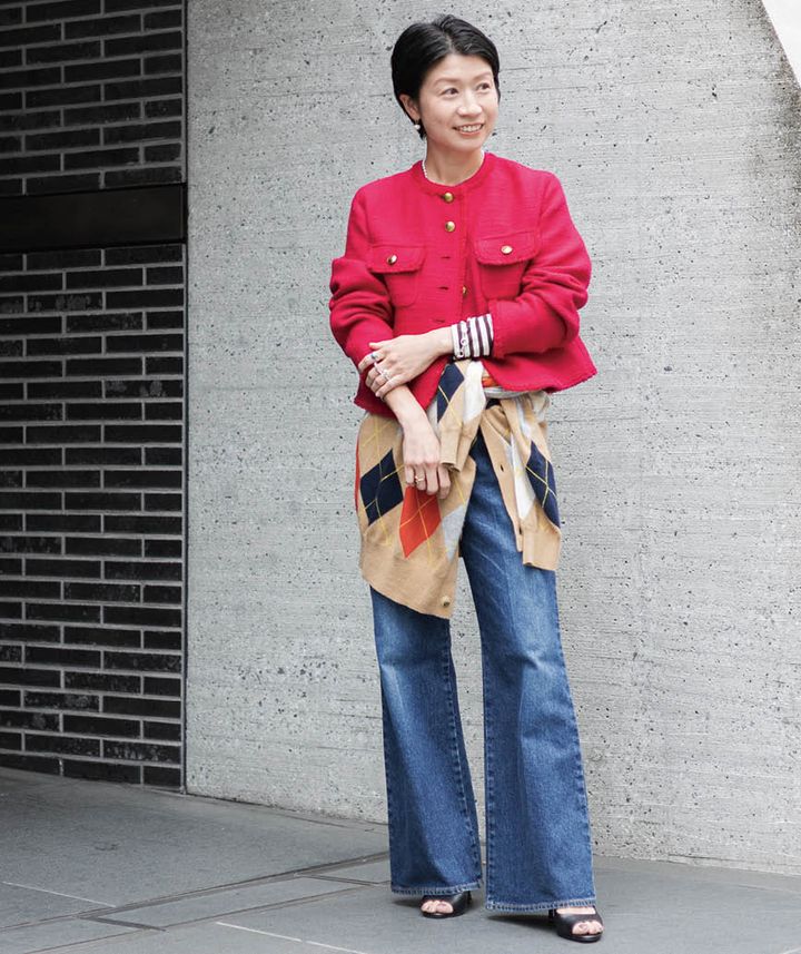 「鮮やかな赤のコンパクトジャケットをデニムでカジュアルダウン。アーガイルのニットを腰に巻いてスタイリングのポイントに」