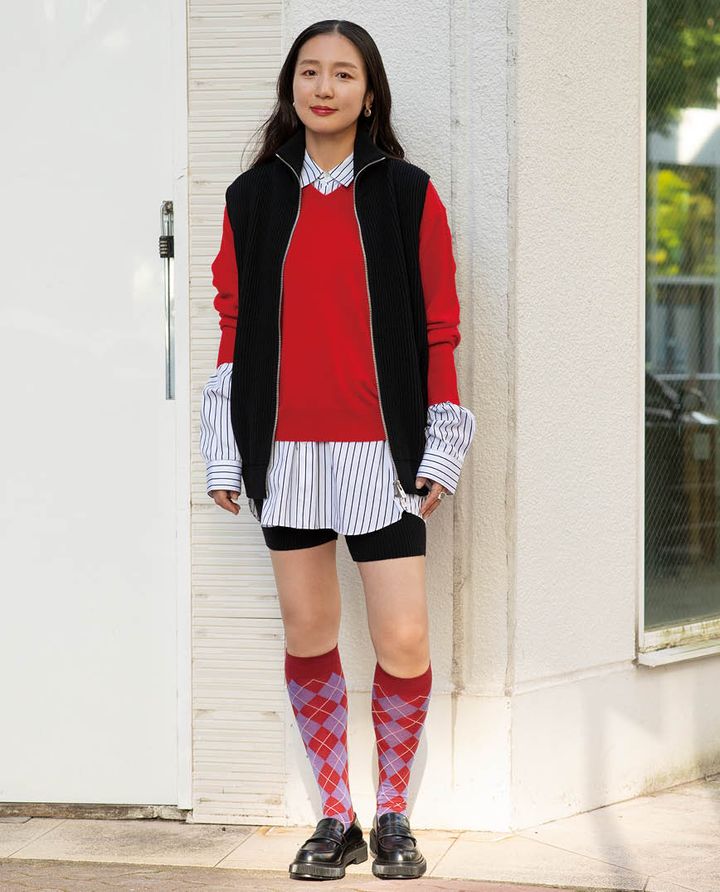 「アーガイルソックスから逆算して、自分らしいトラッドを追求。ニット×ニットの組み合わせと袖から出したシャツのボリューム感が気に入っています」