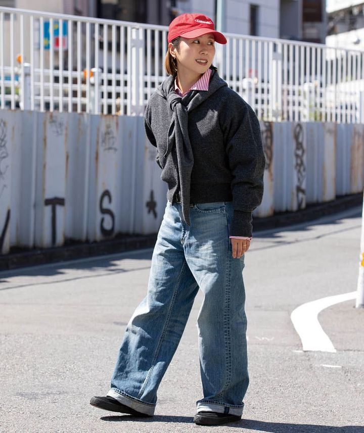 「グレーのカーディガンに赤いストライプシャツを重ねたカジュアルなデニムスタイル。キャップと三角ストールでトレンド感をプラスしました」