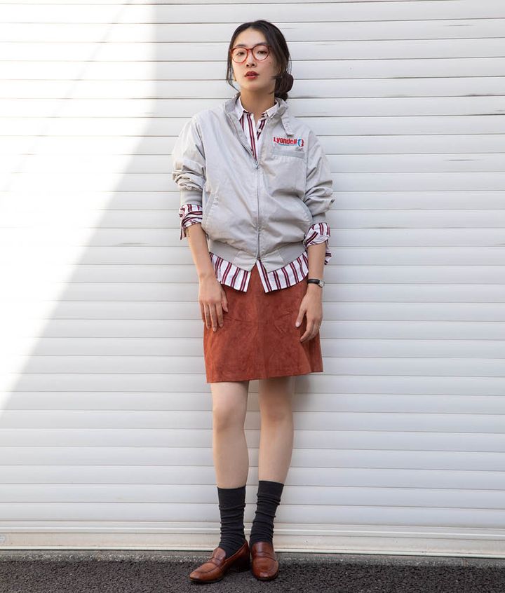 「レザースカートとナイロンブルゾン、シャツを重ねてテイストMIXを楽しみました。カジュアルになり過ぎないよう足元はローファーをセレクト」
