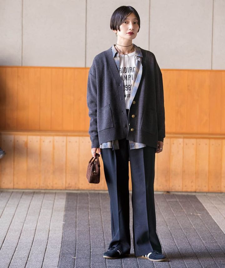 カーディガン¥10,450、シャツ¥11,000、ロンT¥6,600、パンツ¥9,900(全てジャーナル スタンダード レリューム)、ネックレス¥15,400(シシ ジョイア)、バッグ¥9,680(ヴェレット)、シューズ¥15,400(アディダス オリジナルス/全てジャーナル スタンダード レリューム ルミネ新宿店)