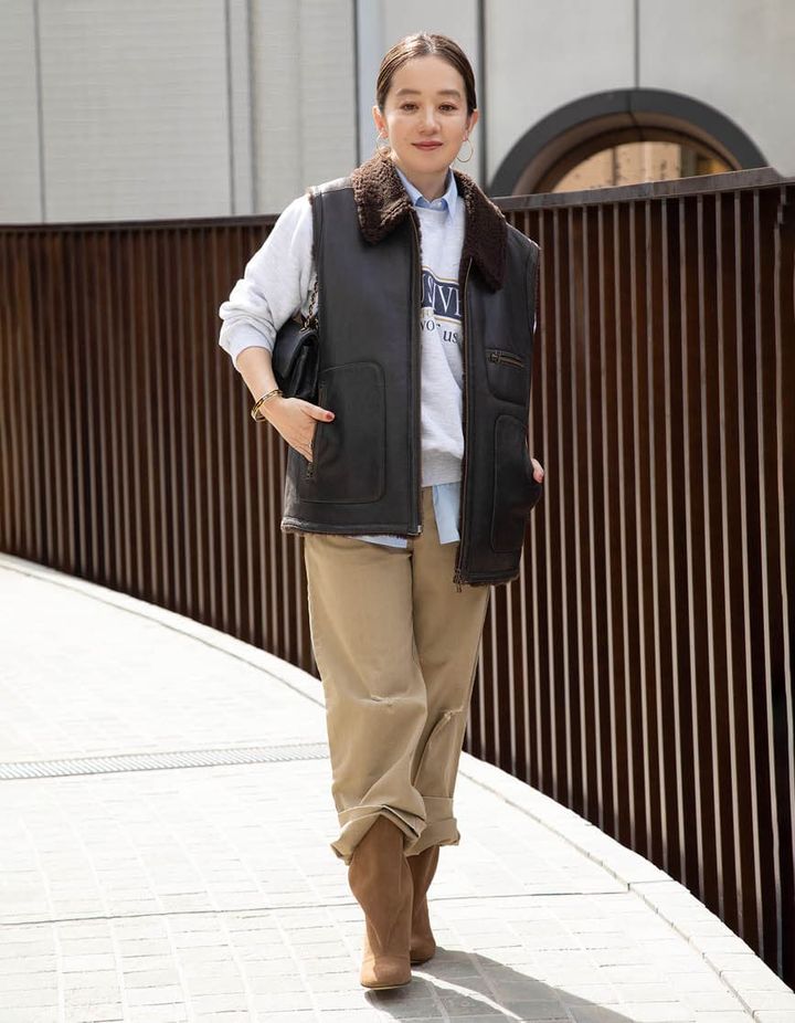 ムートンベスト¥187,000、チノパン¥42,900、中に着たノースリーブシャツ¥25,300(全てブリル)、スエット¥13,200(グッドロックスピード)、ブーツ¥103,400(ブレンテッラ/全てBRILL NEWOMAN新宿店)、シャネルのバッグは本人私物