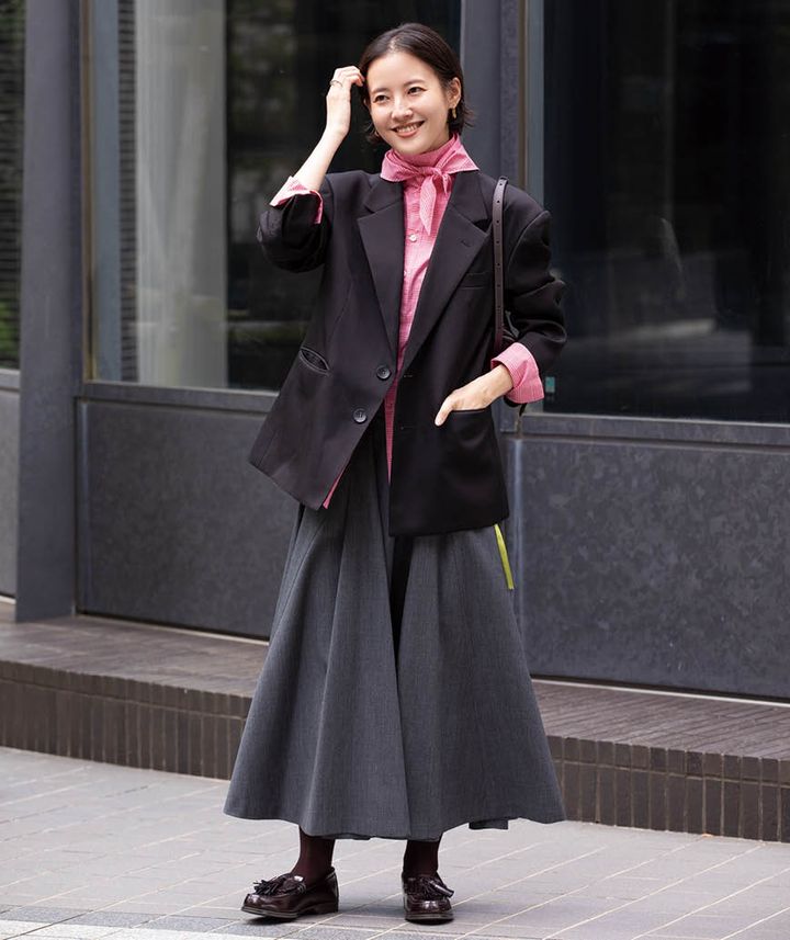 「どこか懐かしさのあるチェックシャツを主役に、同布のスカーフでポイントを持たせました。ミディ丈スカートで今季らしいバランスに仕上げています」