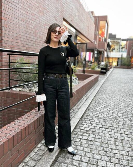 「ぴったりとした黒ニット」は「黒ワイドデニムパンツ」と相性バツグン。ワイドデニムをタイトシルエットのニットが引き締め、メリハリのある着こなしに。