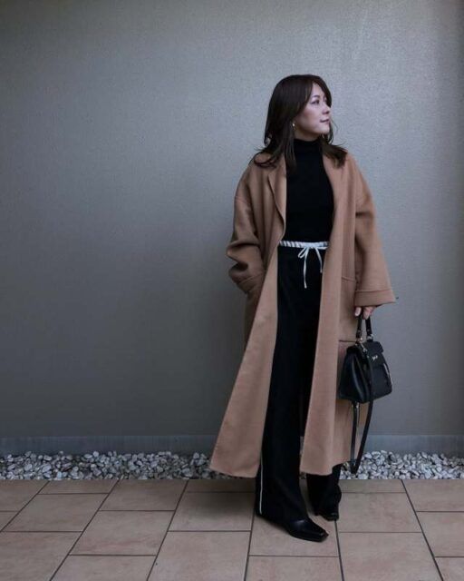 「シンプルな黒ニット×黒パンツ」に羽織るアウターは、ベージュ・ブラウンなど茶系のロングコートが映えますよ。羽織るだけで黒1色のコーデが和らぎクリーンな装いに。コートの前を開けて着こなすと、黒の上下が縦長シルエットを強調してスタイルアップも狙えます。