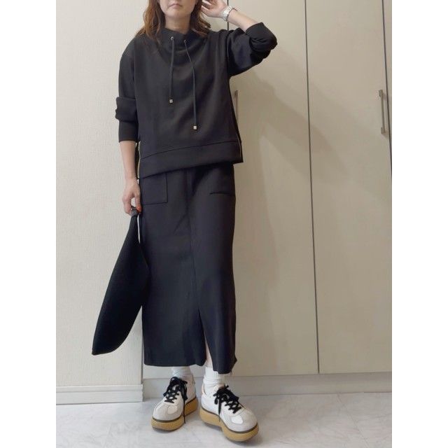 モードに着こなす「スカート×パーカーのオールブラックコーデ」
