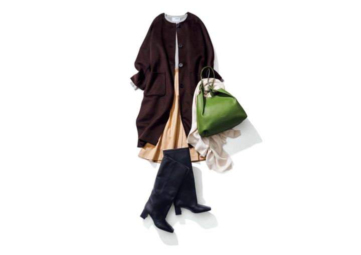 ロングコート¥27,000/PLST サイドプリーツスカート¥24,200/アルページュストーリー ニット¥22,000/スリードッツ(スリードッツ表参道店) トートバッグ¥75,900/ジャンニ キアリーニ(ジャンニ キアリーニ 銀座店) ロングブーツ¥79,200/ファビオ ルスコーニ(エリオポール代官山) 大判ストール¥4,390/ZARA(ザラ)