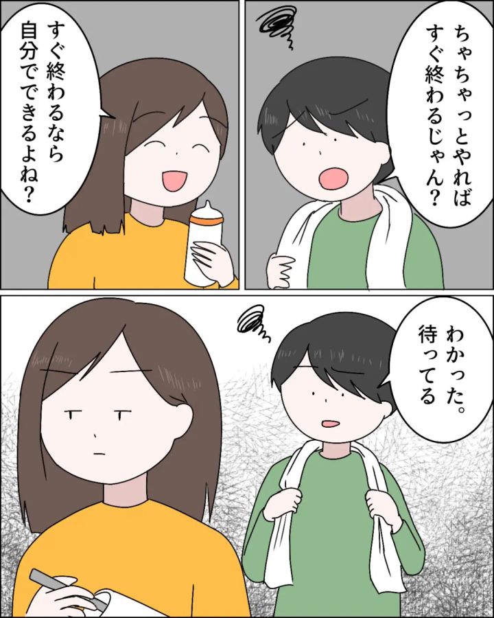 「ちゃちゃっとやればすぐ終わるじゃん?」と言い出すマサオに、「すぐ終わるなら自分でできるよね?」と言うと、「わかった。待ってる」と決して自分ではやろうとしないマサオにうんざり。思いっきり無視してやりました。