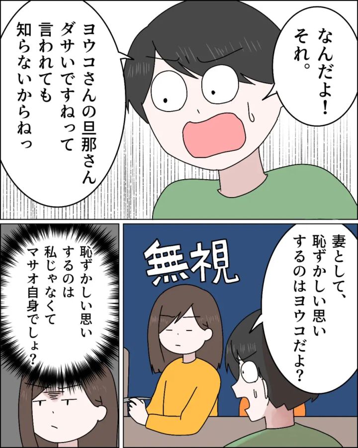 すると、「なんだよ!それ。ヨウコさんの旦那さんダサいですねって言われても知らないからねっ。妻として、恥ずかしい思いするのはヨウコだよ?」と私に詰め寄るも完全に無視を決め込んだ私は、「恥ずかしい思いするのは私じゃなくてマサオ自身でしょ」と心の中で呟いたのでした。