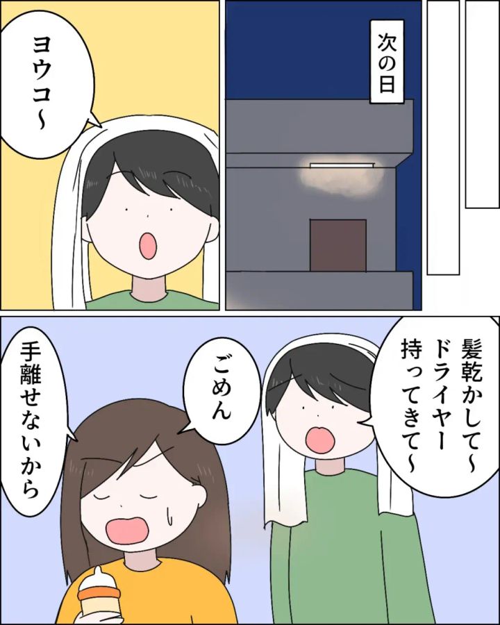 「もしかして、結婚する前髪とかお義母さんに乾かしてもらってたの?」ふとそう思ってマサオに聞くと、「え?そうだけど?」と平然と答えられ、「私はお義母さんの代わりだったのか・・」と落ち込んだものの、「母さんの代わりじゃないってば!」と言われても、「もうどうでもいいし」と思い、「これからはやるつもりないからね」と言い捨てたのでした。