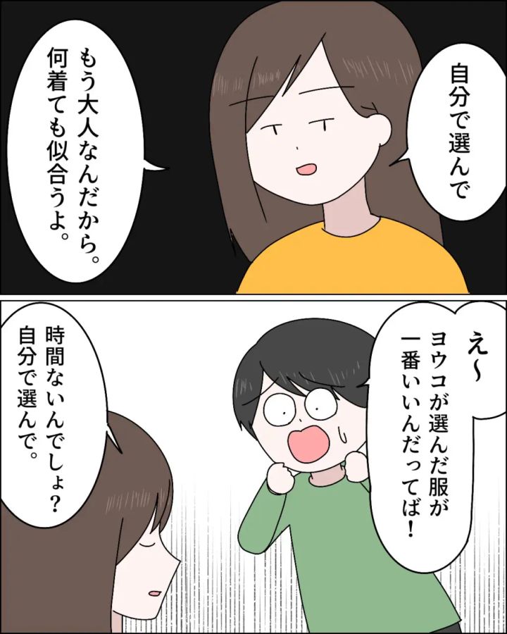 「自分で選んで。もう大人なんだから。何着ても似合うよ」私がそう言うと、「え~。ヨウコが選んだ服が一番いいんだってば!」とマサオが諦めずに言うのを聞いても、「時間ないんでしょ?自分で選んで」と突き放しました。