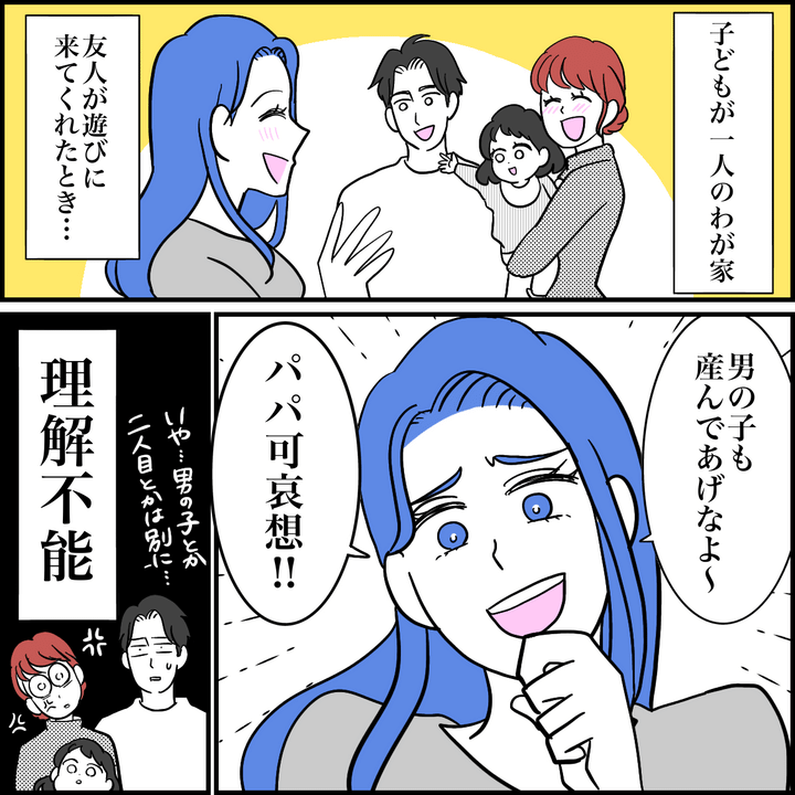 友人女性の言葉にパパもママも絶句。理解不能の極みですよね。パパが「男の子もほしい」とか「2人目がほしい」とか言ったわけでもなさそうなので、見事なまでの場違い発言です。
