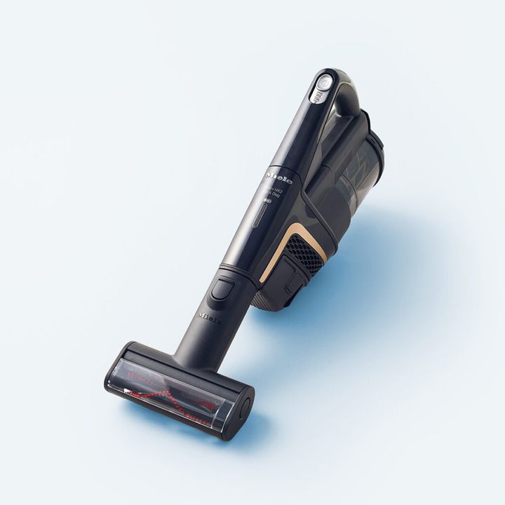〈ミーレ〉初となるコードレス掃除機シリーズより、”徹底的な掃除力”を誇る「Triflex HX2」。「憧れの〈ミーレ〉も、スティック型の掃除機なら生活に取り入れやすい。重量感があることで床面にも密着し、カーペットが浮かび上がるほどの圧倒的な吸引力に感動。フローリングの溝のごみや、絨毯に入り込んだ糸くずまで逃しません。さらに、このハイパワーにして動作音が気にならないのも驚きました。モーターは本体上部と下部に付け替えが可能で、上にセットすればベッドや家具の隙間までくまなくお手入れできるし、下に設置すると自立し、重心が下がることで重さも感じづらくなります」