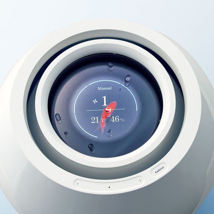 内部構造を変更し前モデルより加湿性能が向上。水を注ぐ部分は高精細ディスプレイで、水量や湿度のほか操作に応じて金魚や紅葉が現れる。「液晶に少し水滴が残るのも、本当の金魚鉢を覗いているようで癒やされる。一度に水を4ℓ入れられるので、補充の頻度もそこまで高くありません」。W34.1×D34.1×H35.2㎝ 本体約5㎏