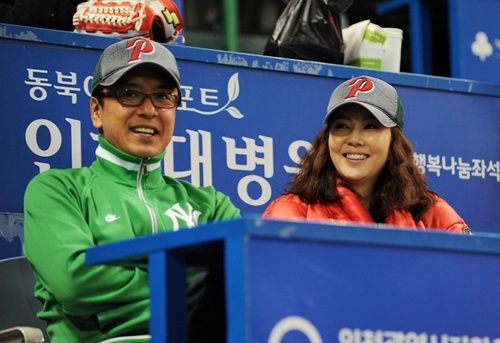野球好きで知られたキム・スンウ。隣は妻で女優のキム・ナムジュ(写真提供=OSEN)
