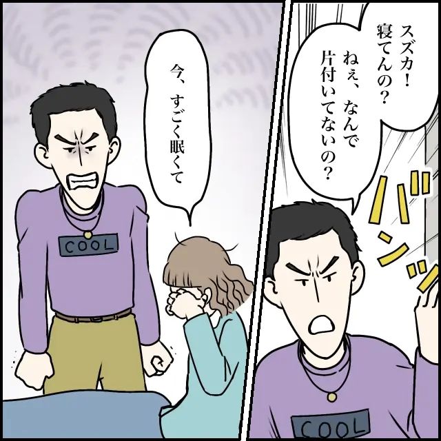 「スズカ!寝てんの?なんで片付いてないの?」私が寝ていようとお構いなしに勢い良くドアを開け、大声を上げるタカシ。妊娠中で体調が安定せず、眠くて仕方がなかったことを必死に伝えましたが、タカシは納得できない様子。拳をぎゅっと握りしめたまま、鋭い視線で私を睨みつけました。