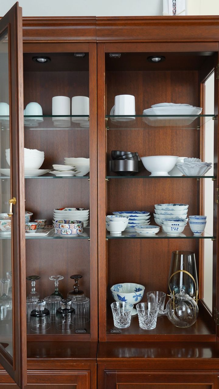 「クリエイティブなお仕事が多く、お家では頭も心もリセットできるように黒を基調としたシンプルな空間にしています。そんなシンプルな空間だからこそ、祖父が昔オーダーメイドした棚が存在感を放ち、素材や構造、シルエットの美しさまで……心ときめくアイテムです。今は、器たちを入れています」
