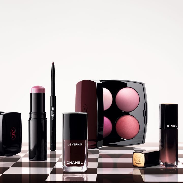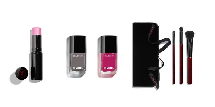 左から:パールが輝くシアーな仕上がりのモーヴピンクはマルチユースのハイライター。ボーム エサンシエル キュート ¥7,370 ルージュ ヌワールから見出した鮮やかなマゼンダとロックなグレイ。ヴェルニ 377、387 各¥5,280 ルージュ ヌワールをまとった3本のブラシを特別なポーチに。レ パンソー ルージュ ヌワール ¥23,650(1/9限定発売) ©CHANEL