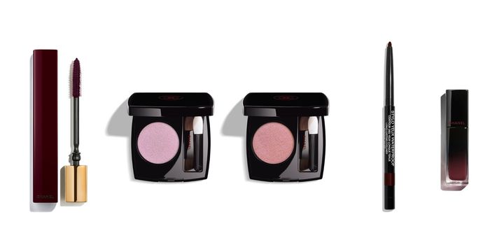 左から:深みのあるルージュ ヌワールのまつ毛で印象的なルックに。ヌワール アリュール 67 ¥7,810(1/9限定発売) メタリックとサテンの輝きが美しいモノアイカラー。オンブル エサンシエル 257 267 各¥6,600 目を囲んで印象的な目もとに。スティロ ユー ウォータープルーフ N 67 ¥4,620 鮮やかなツヤと発色を。ルージュ アリュール ラック 167 ¥6,930(以上1/9限定発売) ©CHANEL