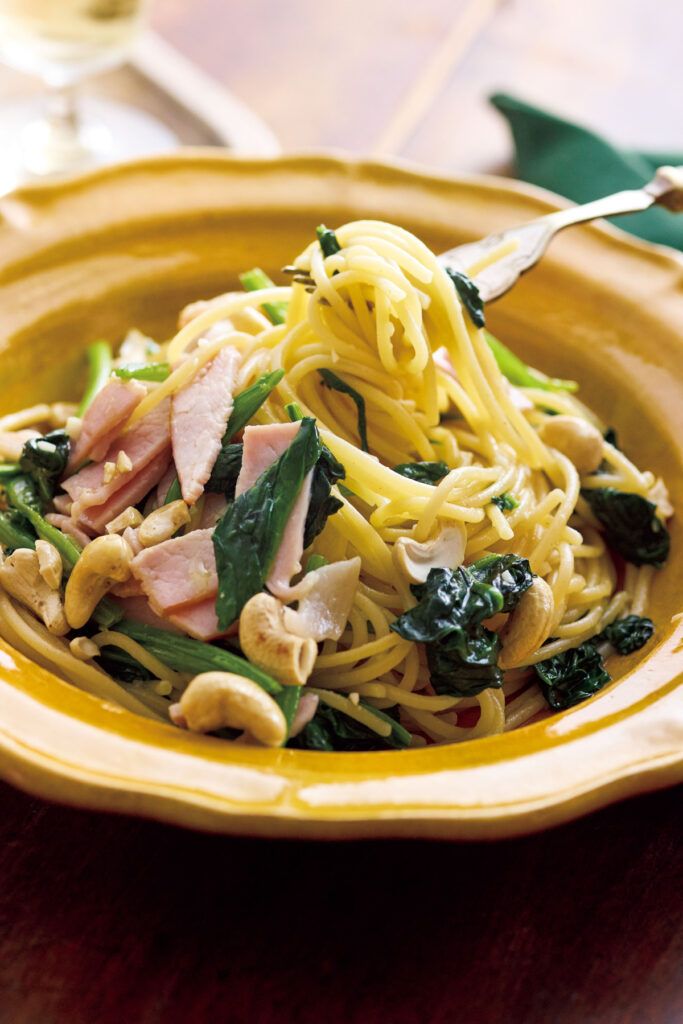 フライパンにカシューナッツを入れて弱火にかけ、香ばしくからいりする。取り出して清潔なふきんにはさみ、包丁の背などで粗く押し砕く。ほうれん草は長さ4cmに切る。ハムは半分に切り、横に幅8mmに切る。