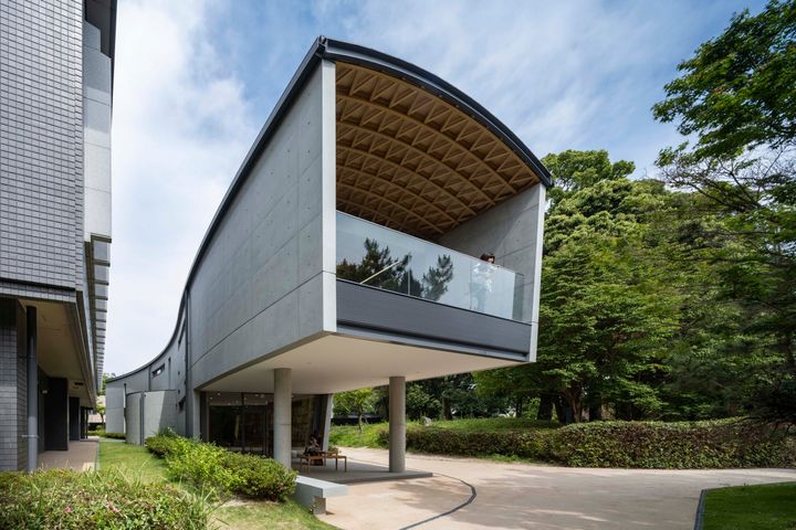 2016年の熊本地震からの復興のシンボルとして寄贈された「こども本の森 熊本」は水前寺江津湖公園の豊かな緑の中に、県立図書館と一体となるように建つ。全体が緩やかにカーブする建物は大きなガラス面を持ち、公園の風景を内部に取り込む開放的な構成だ。