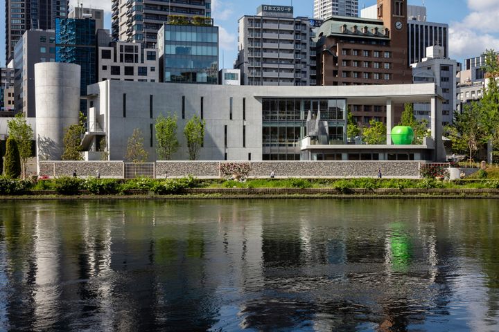 2020年にオープンした「こども本の森 中之島」は3層吹き抜けの館内の壁が全面本棚になったまさに“本の森”。子どもたちが好きな場所でのびのびと読書ができるよう、腰掛けられる中央の大きな階段や迷路のような通路、本棚の間に設けた小さな読書スペースなどさまざまなスペースが用意されている。エントランスポーチにある大きな青いリンゴのオブジェ(写真右)には生涯いつまでも青春(熟さない青いままのリンゴ)の最中でいられる大人になってほしいという安藤の願いが込められている。