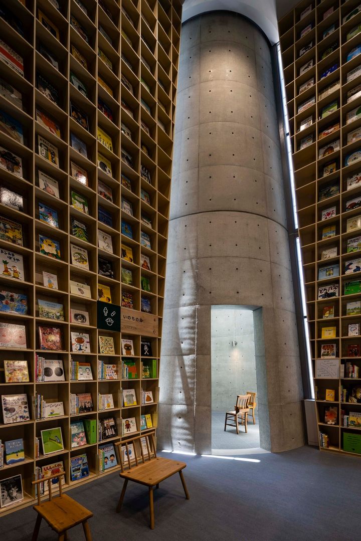 館内のスツールや本棚のテーマを示す看板には六甲山で採れる木々など兵庫県産の素材を用い、子どもたちが自然素材に触れながら読書を楽しめるようになっている。またコンクリート壁が天まで伸びる円筒型の休憩室は、他の読書スペースとはまた異なる空間。トップライトから降り注ぐ光を静かに感じる教会のような静謐な時間が流れる。この部屋に置かれているチャーチチェア(教会や礼拝堂で使われる木製椅子)の背もたれにある聖書を入れるポケットには、この部屋で読んでほしい本を週替わりで収めている。