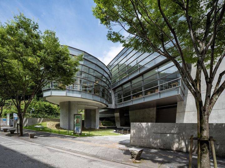 司馬遼太郎の小説をテーマにした「坂の上の雲ミュージアム」は2007年に安藤が設計した美術館。その建物に寄り添うように増築された「こども本の森 松山」は2025年7月にオープンしたばかりだ。松山城の麓、歴史的建造物が点在する文化エリアに位置するこの施設は、2つの三角形を重ねたような特徴的な形のミュージアムとは対照的に、図書館は「楕円」のフォルム。スリット状の窓からは国重要文化財「萬翠荘」の美しい洋館建築を切り取って眺めることができ、歴史との対話が生まれるよう設計されている。