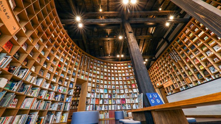 天井には熊本県産ヒノキを格子状に組んだ木組みが広がり、コンクリートの硬質さと木の温かみが美しく調和する。本棚に並ぶ本は上段にあるものはすべて表紙を正面にして陳列。文字が読めない年齢の子どもでも、あの本を読んでみたい!と思ってもらえるよう、背表紙ではなく表紙が目に留まるように陳列されている。同じ本を下段に並べており、興味をもった本にすぐ手を伸ばせるよう工夫されている。また「こども本の森」では館内だけでなく、外で本を読むことも可能。特に公園内にある熊本では、テラスに屋外家具がおかれているスペースもある。