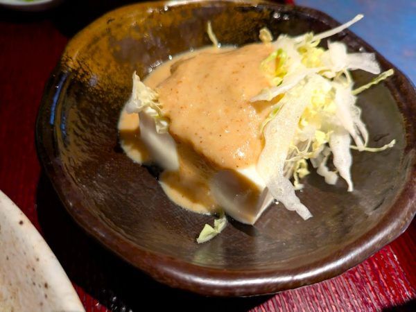 お豆腐の上には刻んだ白菜、その上にはたっぷりの胡麻ダレ、下には山芋の短冊が敷き詰めてあります。創作和食サラダですよね。多分。(笑)